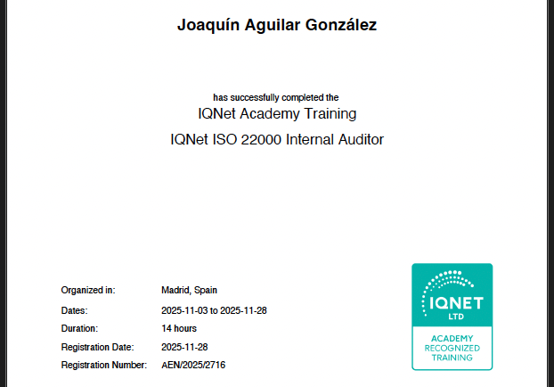 Descripción del Certificado IQNet ISO 22000 Internal Auditor